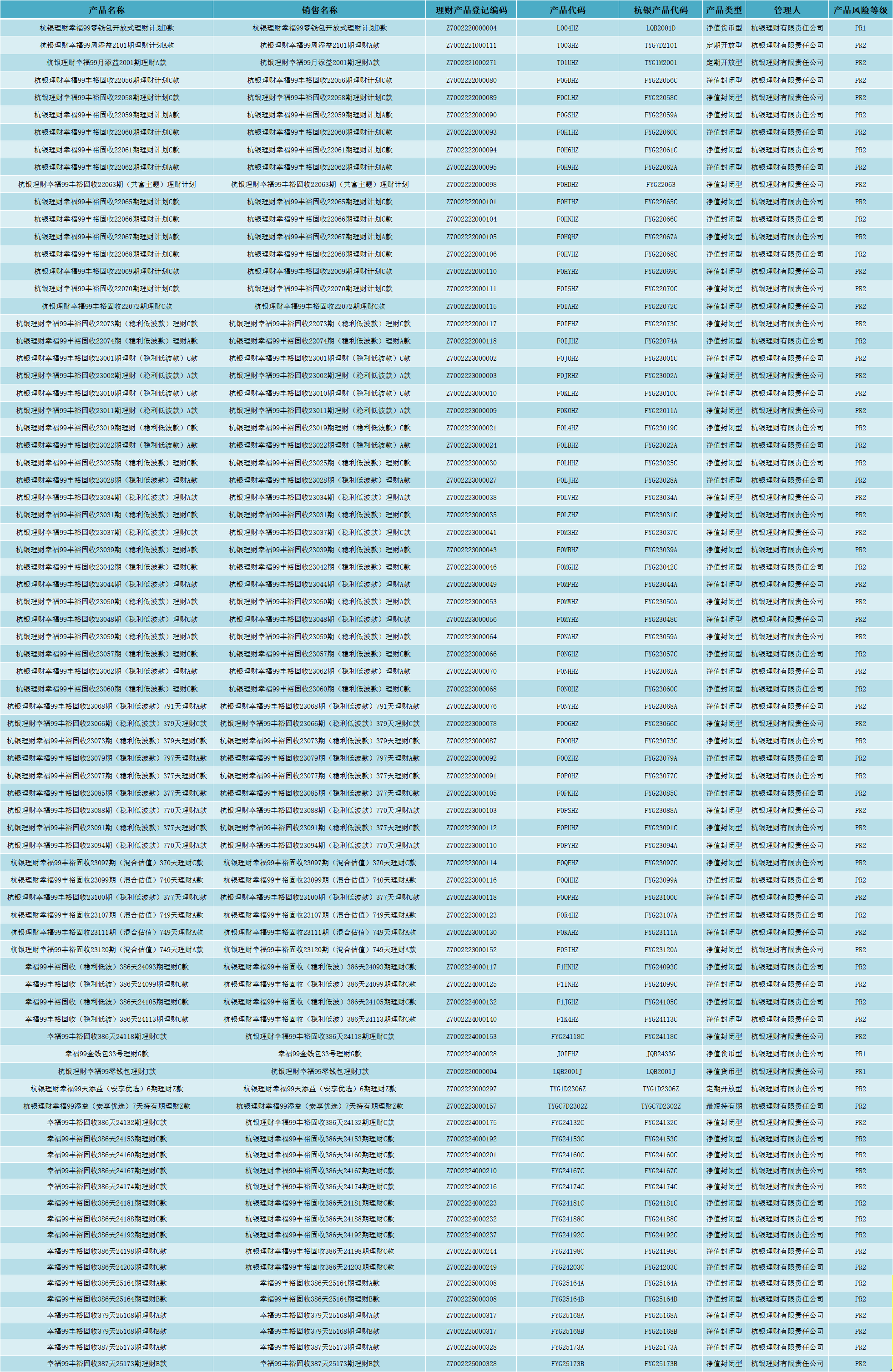 在售代销杭银理财产品清单