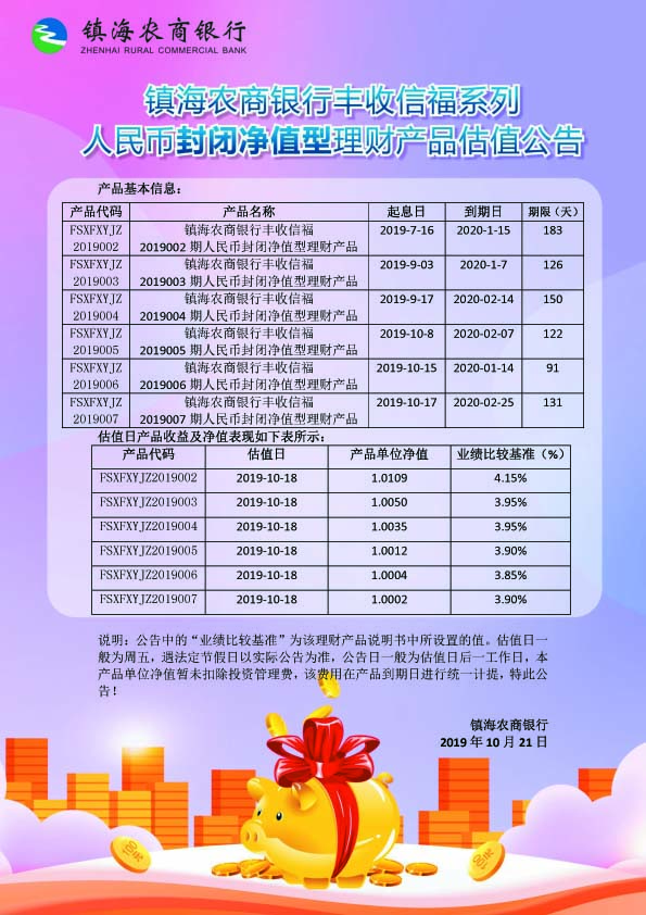 理财产品估值公告(20191021)