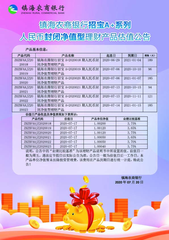理财产品估值公告(20200720)