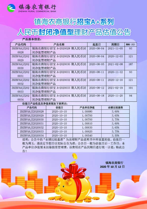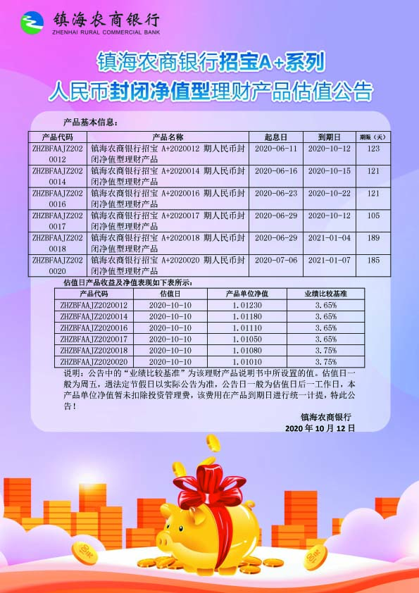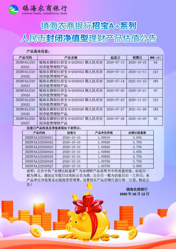 理财产品估值公告(20201012)