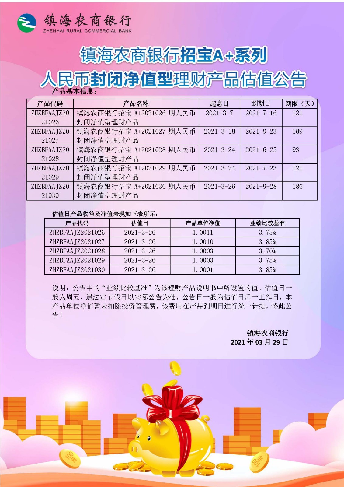 理财产品估值公告(20210329)