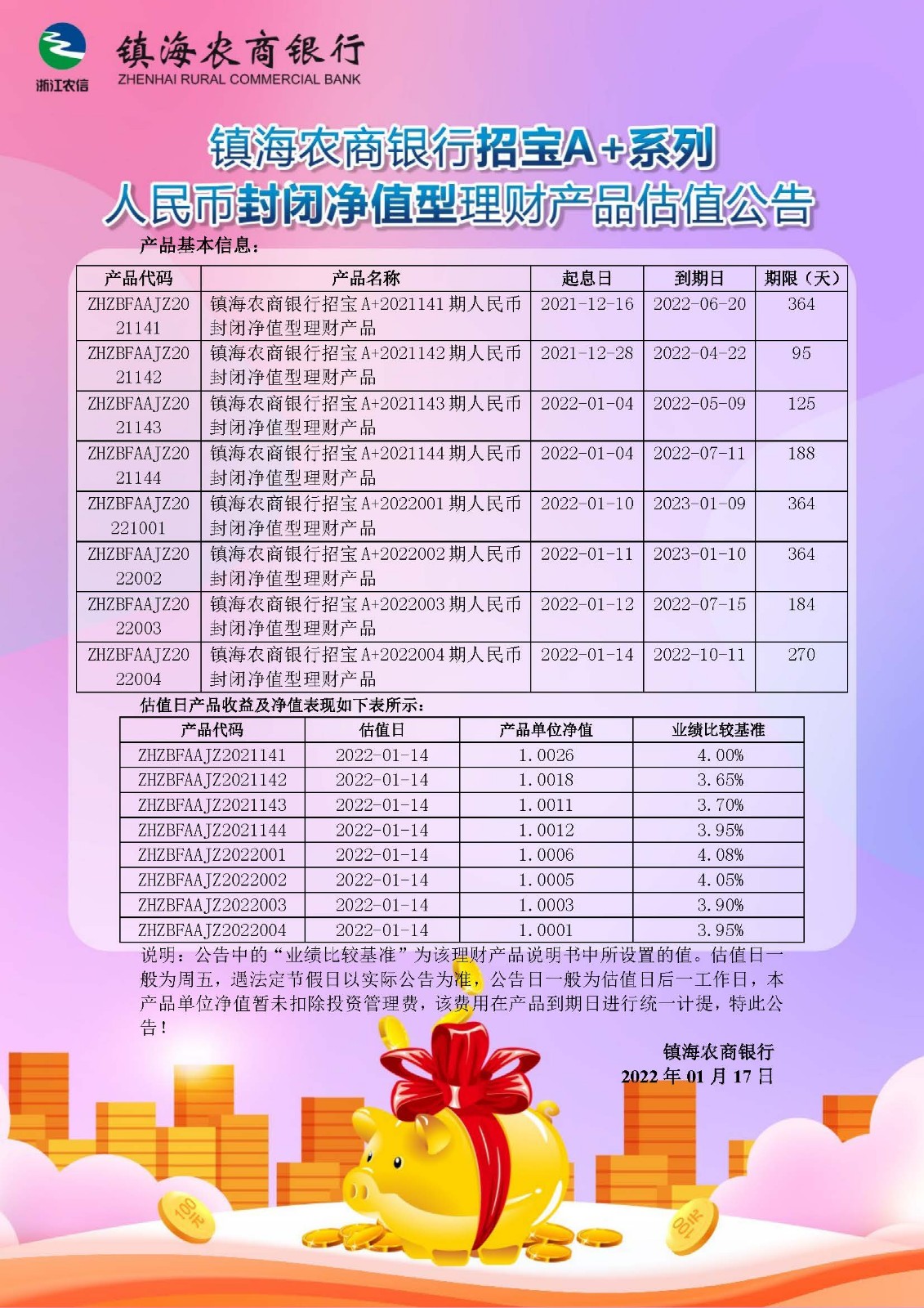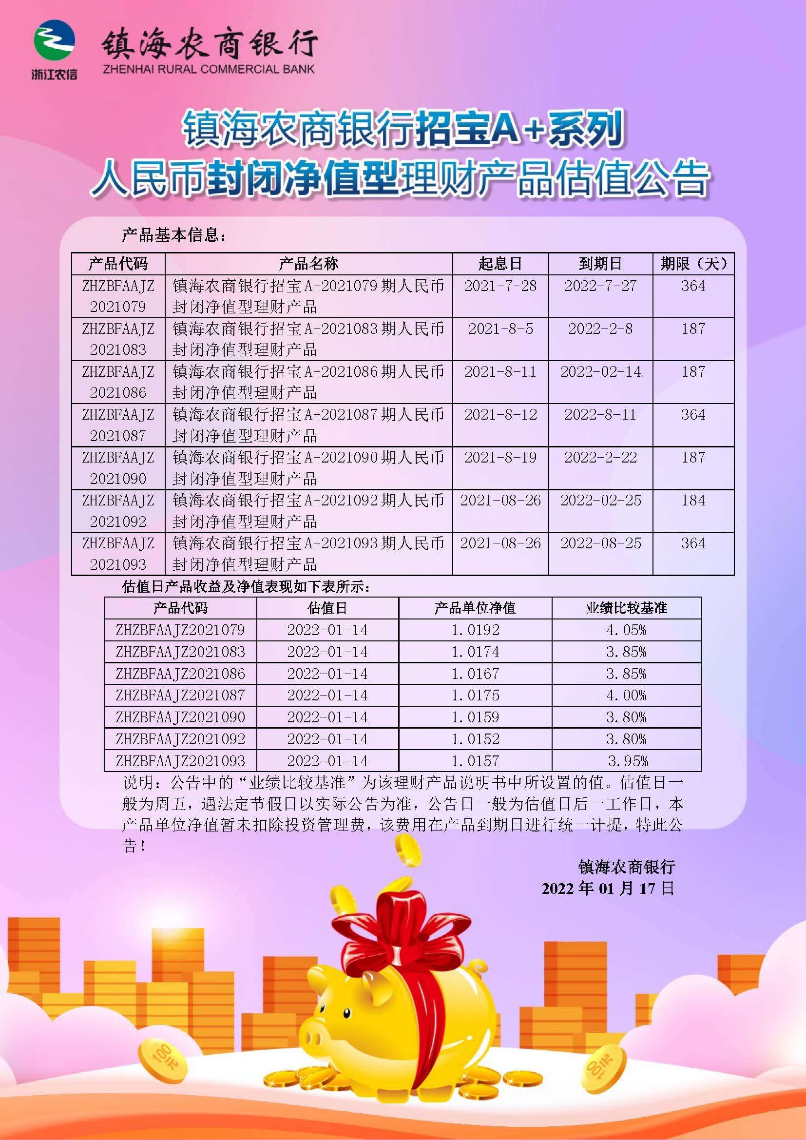 理财产品估值公告(20220117)