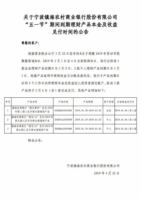 关于宁波镇海农村商业银行股份有限公司“五一节”期间到期理财产品本金及收益兑付时间的公告 2019.04.22
