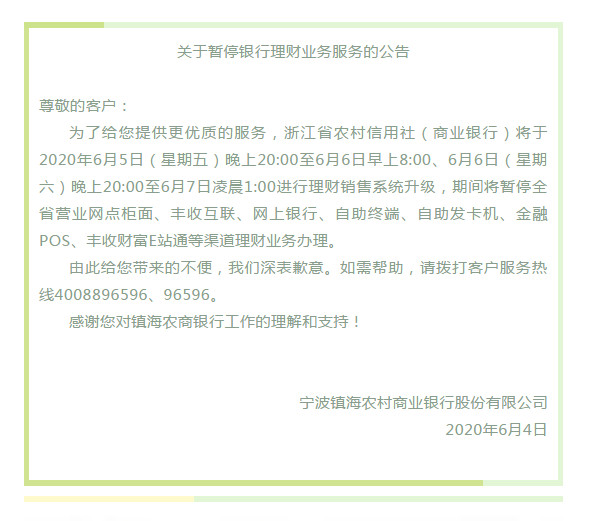 关于宁波镇海农村商业银行股份有限公司“五一劳动节”期间到期理财产品本金及收益兑付时间的公告 2020.04.26