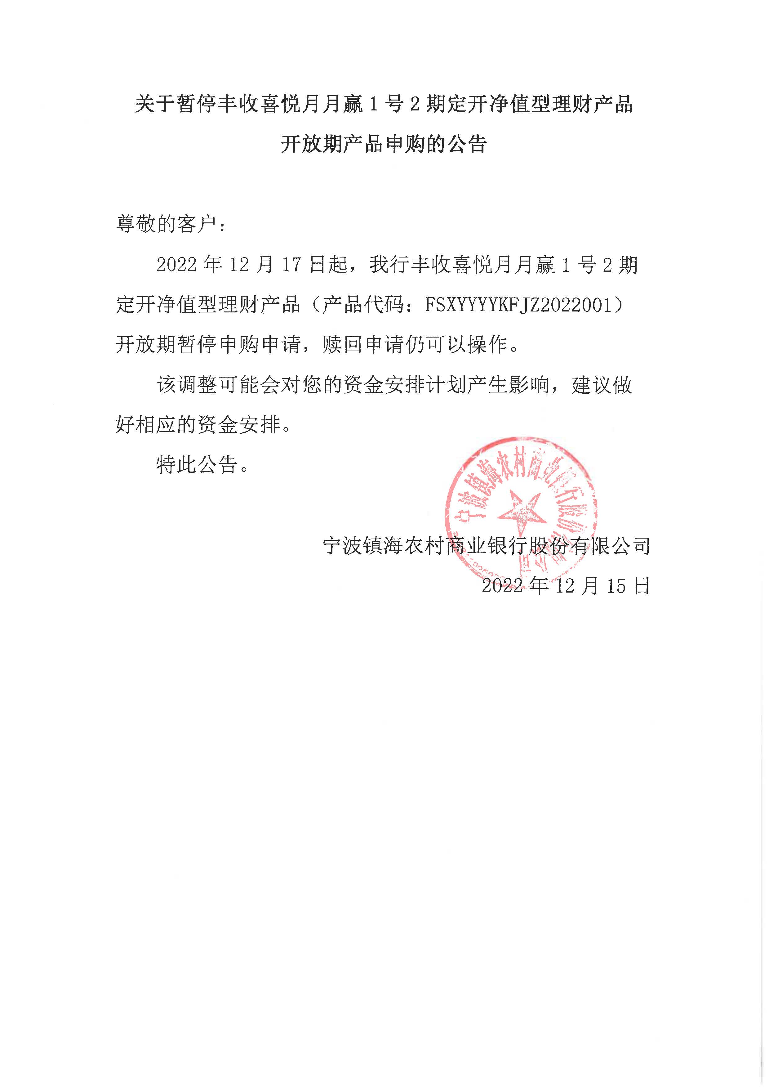 关于暂停丰收喜悦月月赢1号2期定开净值型理财产品开放期产品申购的公告