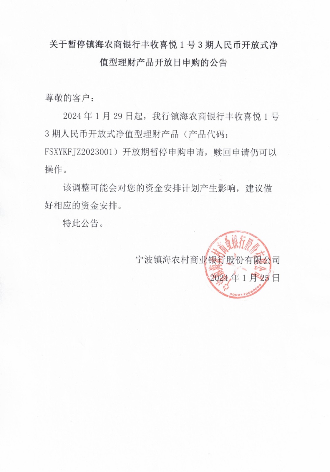关于暂停镇海农商银行丰收喜悦1号3期人民币开放式净值型理财产品开放日申购的公告 2024.1.25.jpg
